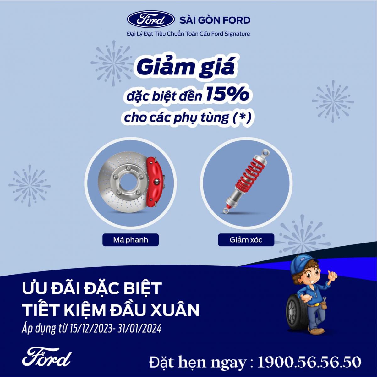 Hiểu được nhu cầu Khách hàng đến Bảo trì, sửa chữa, chỉnh trang đang tăng cao để chuẩn bị chào đón Năm mới và mùa Tết Nguyên Đán, Ford Nam Sài Gòn triển khai Chương trình đặc biệt giảm giá lên đến 15% phụ tùng Má Phanh và Hệ thống treo (Giảm xóc).
