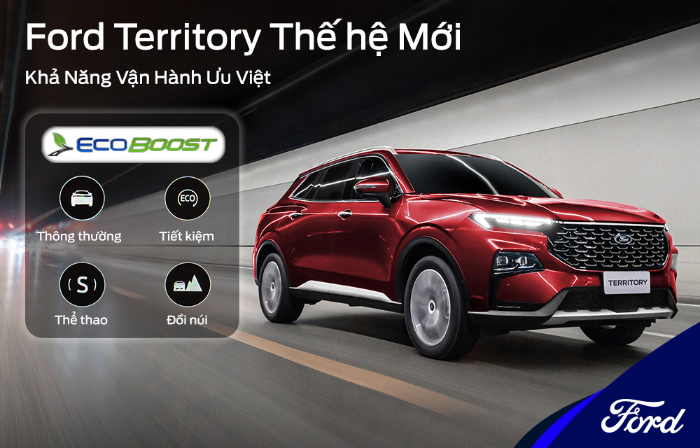 Ford Territory thế hệ mới sở hữu động cơ Ecoboost 1.5L với công suất ấn tượng lên đến 160 mã lực tương đương với công suất động cơ 2.0 thông thường của Ford. Tại Việt Nam, mọi phiên bản đều được trang bị 4 chế độ lái bao gồm Eco (Tiết kiệm), Normal (Bình thường), Sport (Thể thao), Mountain (Đồi núi), để khách hàng có thể tự tin cầm vô lăng và nâng cao trải nghiệm lái, dù là khi di chuyển trong thành phố hay là khi tận hưởng các chuyến du lịch đường dài.